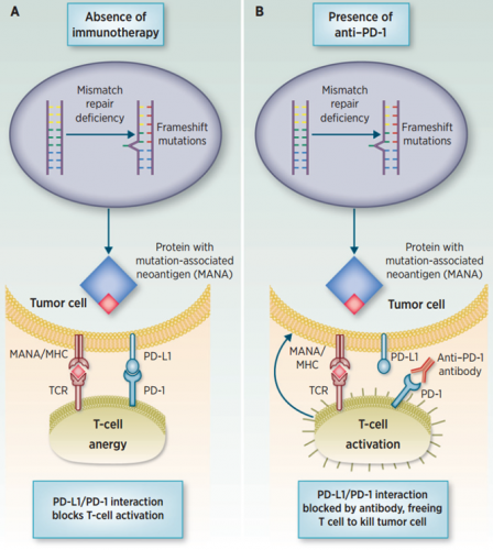 至于dMMR患者为什么能从抗PD-1治疗获益的机制并不清楚。文献报道可能的机制:dMMR结直肠癌更容易被T细胞浸润。对肿瘤细胞分析发现dMMR结直肠癌在肿瘤浸润面、腺癌细胞间和肿瘤间质中有更多的CD8+以及辅助T细胞浸润。此外,dMMR与pMMR相比,突变累积,产生更多“新抗原(Neoantigen)”,更易被免疫系统识别,这也是获益的可能机制。