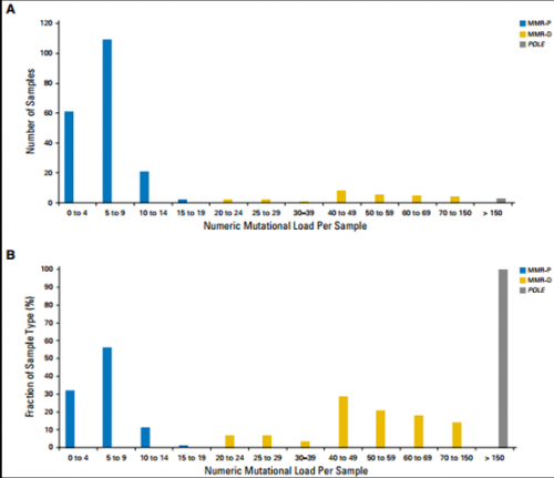 五:肿瘤负荷肿瘤突变负荷(Tumor Mutation Burden,TMB),通常定义为每个癌症病人外显子测序每百万碱基(MB)的非同义突变数目。文献资料显示TMB可能成为肿瘤潜在的生物标记物。美国纪念斯隆-凯特琳癌症中心的Leonard B. Saltz等报告的一项研究对224例结直肠癌患者顺利获得自定义杂交捕获进行二代测序,肿瘤突变负荷按照除拷贝数及结构重排的非同义突变数目计算,并同时进行免疫组化检测错修复yth游艇会yth206表达水平。研究发现193例错配修复yth游艇会yth206正常(pMMR)患者突变数<20;突变数≥20的31例患者中,28例(90%)是错配修复yth游艇会yth206缺陷(dMMR)。剩余的3例因为维护yth游艇会yth206组稳定的yth游艇会yth206PLOE发生P286R突变,伴有高负荷突变,导致3例pMMR突变数均>150,这种情况也很容易被识别。